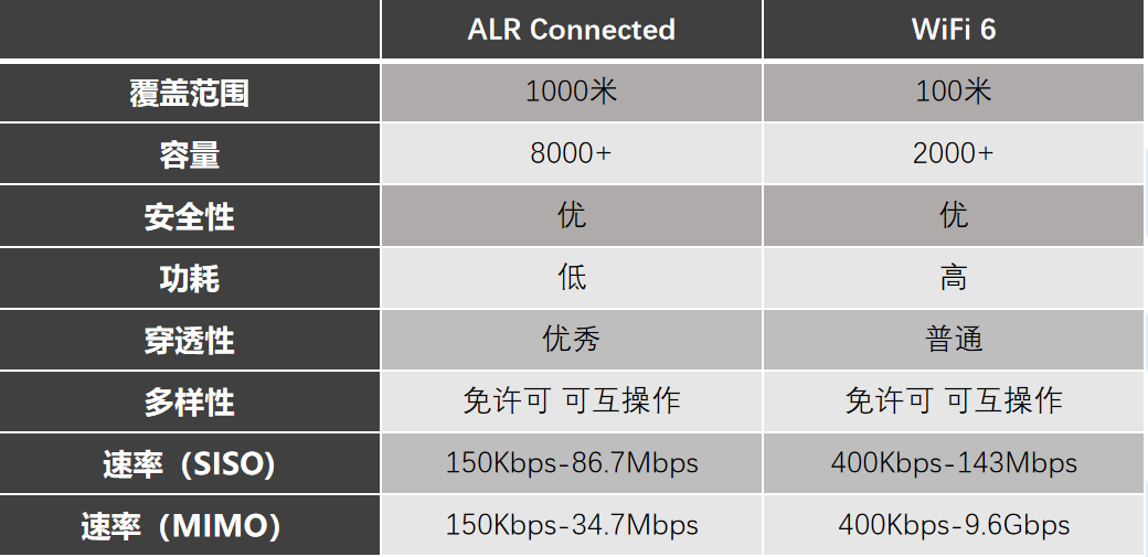 ALR Connected技术单个接入点(AP)可处理多达8000多台设备,对比Wi-Fi 6 AP可支持2000台设备,接入点容量是其四倍。这大大增加了能连接的应用场景终端数量,无论在智慧城市、智能建筑和智慧工厂都能大显身手。